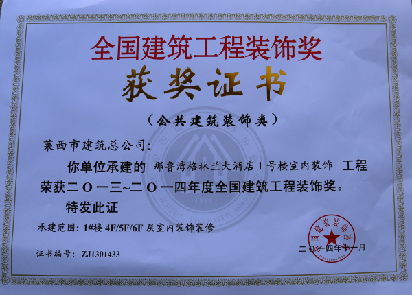 12月11日至12日,中國(guó)建筑裝飾三十年紀(jì)念大會(huì)在北京國(guó)家會(huì)議中心隆重召開(kāi)。住建部副部長(zhǎng)王寧、中國(guó)建筑裝飾協(xié)會(huì)會(huì)長(zhǎng)李秉仁、秘書長(zhǎng)劉曉一等領(lǐng)導(dǎo)到會(huì)。大會(huì)對(duì)2013—2014年全國(guó)裝飾獎(jiǎng)獲獎(jiǎng)單位進(jìn)行了表彰。我公司施工的那魯灣格蘭大酒店1#樓室內(nèi)裝飾工程獲獎(jiǎng)。