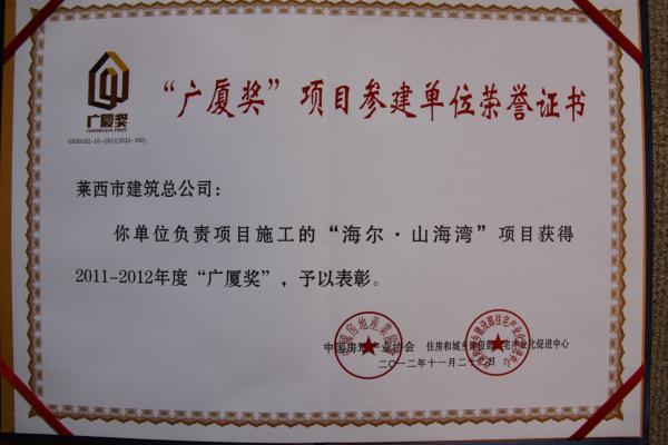 11月22日中國房地產(chǎn)協(xié)會2011-2012年度“廣廈獎”頒獎大會在北京舉行。我公司施工的“海爾·山海灣”工程獲此榮譽。
