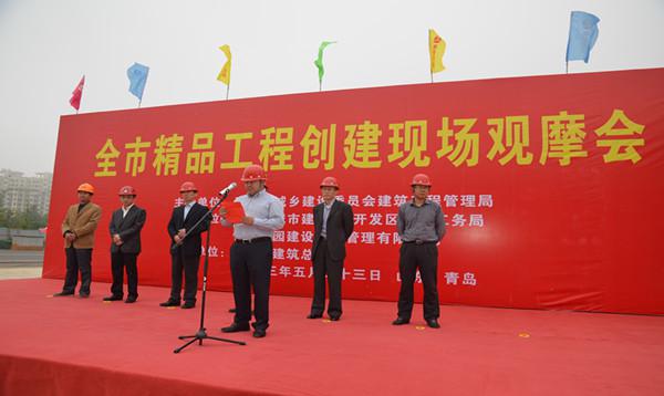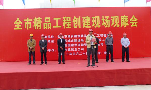 5月23日上午,青島市精品工程創(chuàng)建現(xiàn)場(chǎng)觀(guān)摩會(huì)在我公司欒健項(xiàng)目部施工的全民健身中心工程順利召開(kāi)。青島市建管局副局長(zhǎng)孫維珉、市質(zhì)監(jiān)站站長(zhǎng)劉昕光、開(kāi)發(fā)區(qū)建設(shè)局副局長(zhǎng)王海建、開(kāi)發(fā)區(qū)建筑工務(wù)局副局長(zhǎng)王建、我公司董事長(zhǎng)孫涌分別在觀(guān)摩會(huì)上發(fā)表講話(huà)。