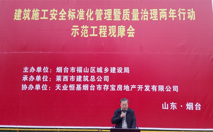 12月1日,煙臺市福山區(qū)城鄉(xiāng)建設(shè)局主辦的煙臺市“建筑施工標(biāo)準(zhǔn)化管理暨建筑工程質(zhì)量治理兩年行動”示范工程觀摩會在七公司仲濤項(xiàng)目部施工的天業(yè)盛世景苑召開。煙臺市質(zhì)檢站站長劉輝生、福山區(qū)城鄉(xiāng)建設(shè)局局長周道隆、分管副局長宋夕純、福山區(qū)建管處主任蔣建、副主任牛成斌、天業(yè)恒基煙臺存寶房地產(chǎn)有限公司總經(jīng)理肖劍、七公司總經(jīng)理吳克祥出席了觀摩會。煙臺市安全、質(zhì)量機(jī)構(gòu)負(fù)責(zé)人以及建設(shè)、監(jiān)理、施工總承包共計(jì)143家單位、項(xiàng)目負(fù)責(zé)人參加了本次觀摩會,觀摩人員達(dá)300余人。