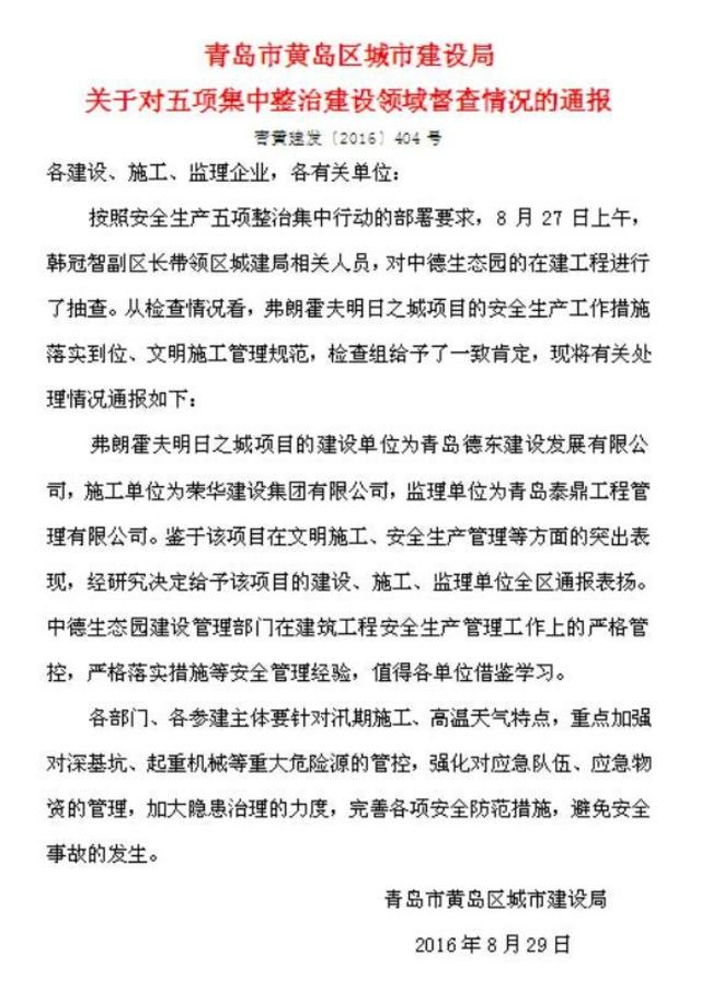 弗朗霍夫明日之城項目 受到黃島區(qū)城市建設(shè)局通報表揚
