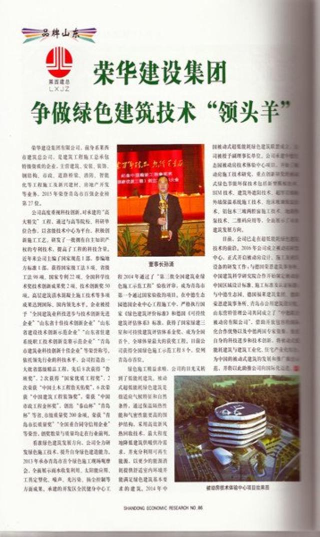 中共山東省委黨校主管的《山東經(jīng)濟(jì)研究》(總第九十五期)期刊在“品牌山東”專欄以“榮華建設(shè)集團(tuán)爭做綠色建筑技術(shù)‘領(lǐng)頭羊’”為題刊發(fā)文章,詳細(xì)介紹了集團(tuán)公司在技術(shù)研發(fā)、科技創(chuàng)新、綠色施工以及低能耗建筑等方面的先進(jìn)成果,并指出“榮華建設(shè)集團(tuán)正借助開放包容的國際化合作優(yōu)勢以及中德兩國專家資源,依托自身科技進(jìn)步和技術(shù)創(chuàng)新,實(shí)現(xiàn)被動(dòng)式低能耗建筑與建筑工業(yè)化、住宅工業(yè)化有機(jī)結(jié)合,推動(dòng)建立中國的被動(dòng)式建筑和技術(shù)規(guī)范”,引起廣泛關(guān)注?!肚鄭u日報(bào)》在《青島建筑業(yè)優(yōu)秀科技創(chuàng)新企業(yè)巡禮》專欄也刊登了該文章,《鳳凰財(cái)經(jīng)》、《山東光明網(wǎng)》等多家網(wǎng)絡(luò)媒體紛紛轉(zhuǎn)載。