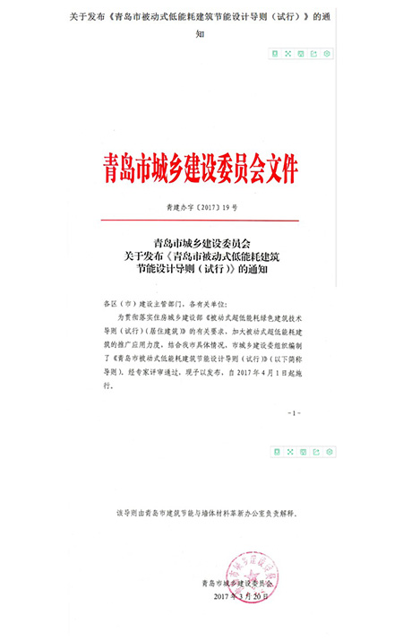 由我集團公司參與編制的全國首個被動房地方標(biāo)準(zhǔn)《青島市被動房低能耗建筑節(jié)能設(shè)計導(dǎo)則》正式頒布實施。