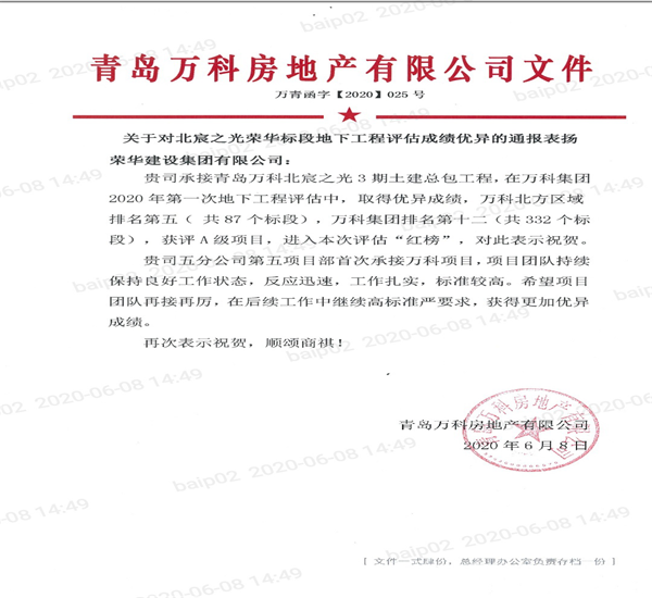 近日,青島萬科房地產(chǎn)有限公司發(fā)來表?yè)P(yáng)信,對(duì)五公司第五項(xiàng)目部施工的青島萬科北宸之光3期土建總包工程提出了表?yè)P(yáng)。