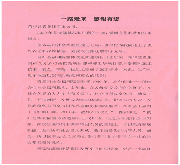 近日,集團總部收到青島市社會福利院發(fā)來的表揚信,對八公司商俊堯和郝中華項目部改造擴建青島市社會福利院項目提出表揚。 自從青島市社會福利院整體改造項目開工以來,第八分公司商俊堯和郝中華項目部嚴格按照施工要求精心施工,合理調(diào)配資源,強化安全質(zhì)量管理,最終安全、高效、優(yōu)質(zhì)地完成了社會福利院整體改造擴建項目,得到社會各界的一致好評。 希望各項目部繼續(xù)保持優(yōu)良的施工風范及服務理念,精益求精,堅持不懈,為集團再創(chuàng)輝煌!