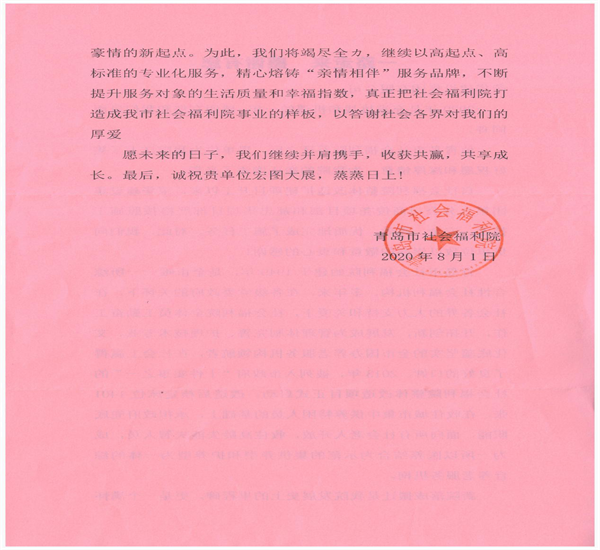 八公司受到青島市社會福利院表揚