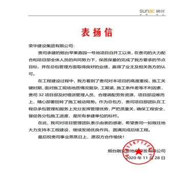近日,集團總部收到煙臺融安房地產有限公司發(fā)來的表揚信,對七公司第三十二仲濤項目部承建的煙臺蘋果嘉園一號地項目提出表揚。