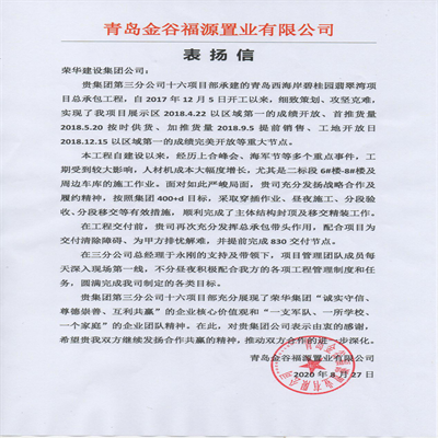 近日,集團(tuán)總部收到青島金谷福源置業(yè)有限公司發(fā)來(lái)的表?yè)P(yáng)信,對(duì)三公司十六(王慎平)項(xiàng)目部施工的青島西海岸碧桂園翡翠灣項(xiàng)目總承包工程提出表?yè)P(yáng)。
