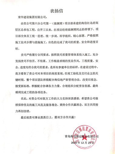 近期,集團總部收到青島海信博遠置業(yè)有限公司發(fā)來的表揚信,對六公司第一(欒淵博)項目部施工的海信紅島府高層區(qū)總承包工程提出表揚。