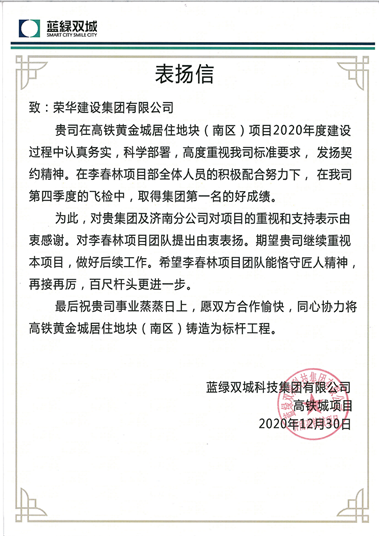 近期,集團總部收到藍綠雙城科技集團有限公司發(fā)來的表揚信,對濟南公司第三十九(李春林)項目部施工的高鐵黃金城居住地塊(南區(qū))提出表揚。