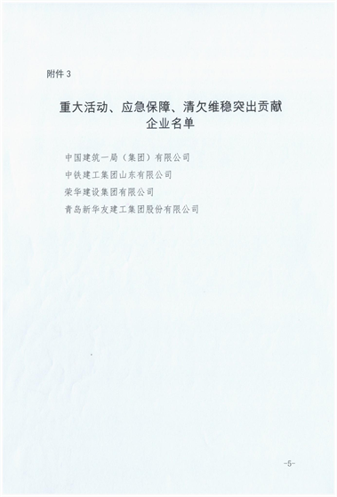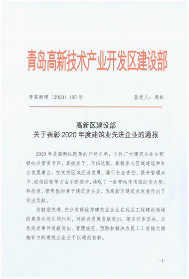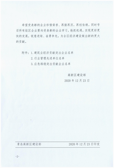 近期,青島高新區(qū)建設(shè)部發(fā)布《關(guān)于關(guān)于表彰2020年度建筑業(yè)先進(jìn)企業(yè)的通報》,三公司第十六(王慎平)項目部施工的青島高新區(qū)碧桂園項目綜合管理水平優(yōu)異,為集團(tuán)公司贏得“行業(yè)管理先進(jìn)單位”稱號,并對集團(tuán)公司在重大活動、應(yīng)急保障、清欠維穩(wěn)方面做出的突出貢獻(xiàn)進(jìn)行表彰。