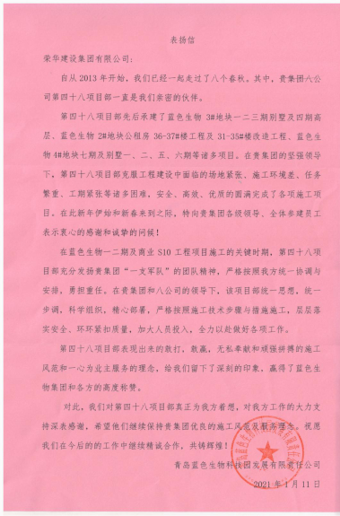 近日,集團(tuán)總部收到青島藍(lán)色生物科技園發(fā)展有限責(zé)任公司發(fā)來的表揚(yáng)信,對(duì)八公司第四十八(郝中華)項(xiàng)目部施工的藍(lán)色生物3#地塊一二三期別墅及四期高層、藍(lán)色生物2#地塊公租房36-37#樓工程及31-35#樓改造工程、藍(lán)色生物4#地塊7期及別墅一、二、五、六期等諸多項(xiàng)目提出表揚(yáng)。