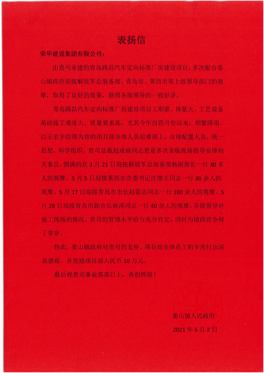 近期,集團(tuán)總部收到姜山鎮(zhèn)人民政府發(fā)來的表揚(yáng)信,對(duì)王宏宇項(xiàng)目部施工的青島路昌汽車定向標(biāo)準(zhǔn)廠房建設(shè)項(xiàng)目提出表揚(yáng)。