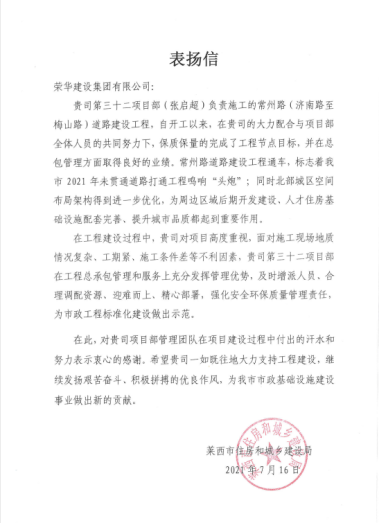 近期,集團(tuán)總部收到萊西市住房和城鄉(xiāng)建設(shè)局發(fā)來的表揚信,對張啟超項目部負(fù)責(zé)施工的常州路(濟(jì)南路至梅山路)道路建設(shè)工程提出表揚。