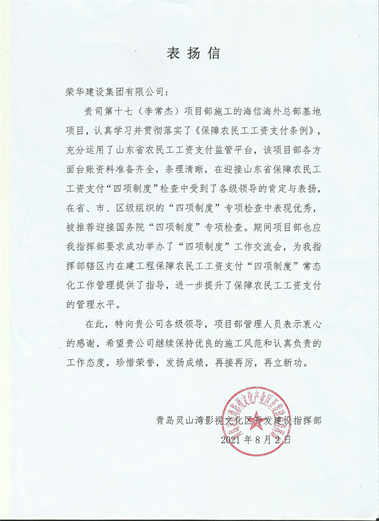 近期,集團總部收到青島靈山灣影視文化區(qū)開發(fā)建設指揮部發(fā)來的表揚信,對李常杰項目部施工的海信海外總部基地項目提出表揚。