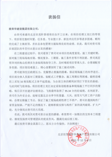 近日,集團公司收到北京世茂嘉年華房地產開發(fā)有限公司發(fā)來的表揚信,對八公司第二十九項目部施工的北京世茂軒景頌項目提出表揚。