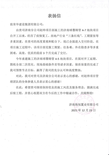近日,集團公司收到濟南海旭置業(yè)有限公司發(fā)來的表揚信,對濟南公司趙帥項目部施工的濟南球墨鑄管A-7地塊項目提出表揚。