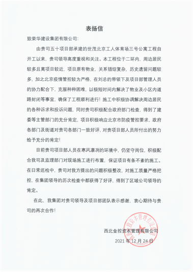 近日,集團(tuán)公司收到西北金控資本管理有限公司發(fā)來的表揚(yáng)信,對八公司史寶座項(xiàng)目部施工的世貿(mào)北京工人體育場三號(hào)公寓工程提出表揚(yáng)。