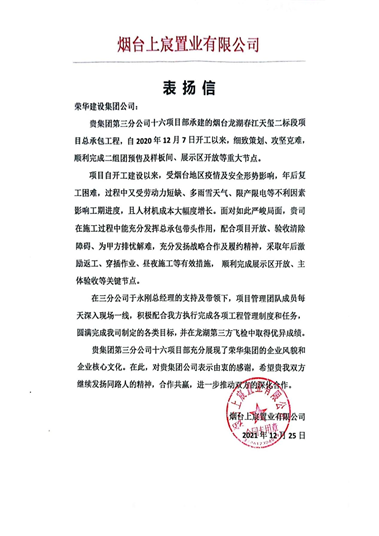 近日,集團(tuán)公司收到煙臺(tái)上宸置業(yè)有限公司發(fā)來(lái)的表?yè)P(yáng)信,對(duì)三公司第十六(王慎平)項(xiàng)目部施工的龍湖春江天璽小區(qū)二標(biāo)段項(xiàng)目提出表?yè)P(yáng)。