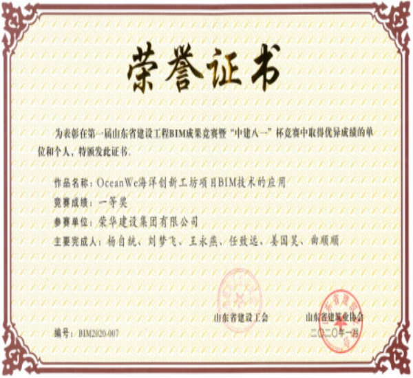 集團(tuán)公司《OceanWe海洋創(chuàng)新工坊項(xiàng)目BIM技術(shù)應(yīng)用》,榮獲山東省建設(shè)工會(huì)、山東省建筑業(yè)協(xié)會(huì)舉辦的第一屆山東省建設(shè)工程BIM成果競(jìng)賽暨“中建八一”杯競(jìng)賽一等獎(jiǎng)。
