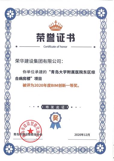 2020年12月16日,青島市建設(shè)智能化協(xié)會(huì)舉辦的關(guān)于2020年度“十佳優(yōu)秀企業(yè)”評(píng)選活動(dòng),集團(tuán)BIM中心報(bào)送的“青島大學(xué)附屬醫(yī)院東院病房樓”、“海爾云谷”以及“黑卓中心”項(xiàng)目分別獲得2020年度BIM創(chuàng)新一等獎(jiǎng)、二等獎(jiǎng)和優(yōu)秀獎(jiǎng),同時(shí),集團(tuán)公司被評(píng)選為2020年度“十佳優(yōu)秀企業(yè)”。