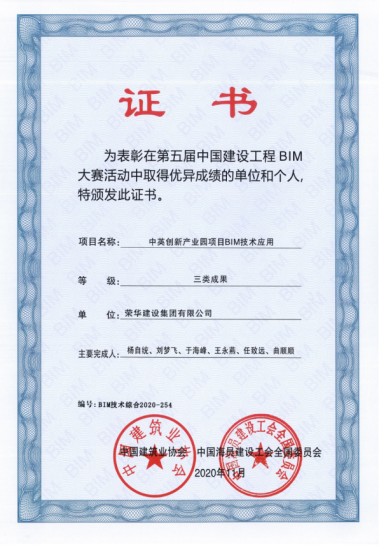 2020年12月16日,中國建筑業(yè)協(xié)會于武漢召開“第五屆建設(shè)工程BIM技術(shù)應(yīng)用交流會”,集團BIM中心主編完成的《淮北吾悅廣場BIM技術(shù)應(yīng)用》、《中英創(chuàng)新產(chǎn)業(yè)園項目BIM技術(shù)應(yīng)用》分別榮獲第五屆中國建設(shè)工程BIM大賽單項一等獎和綜合三等獎。